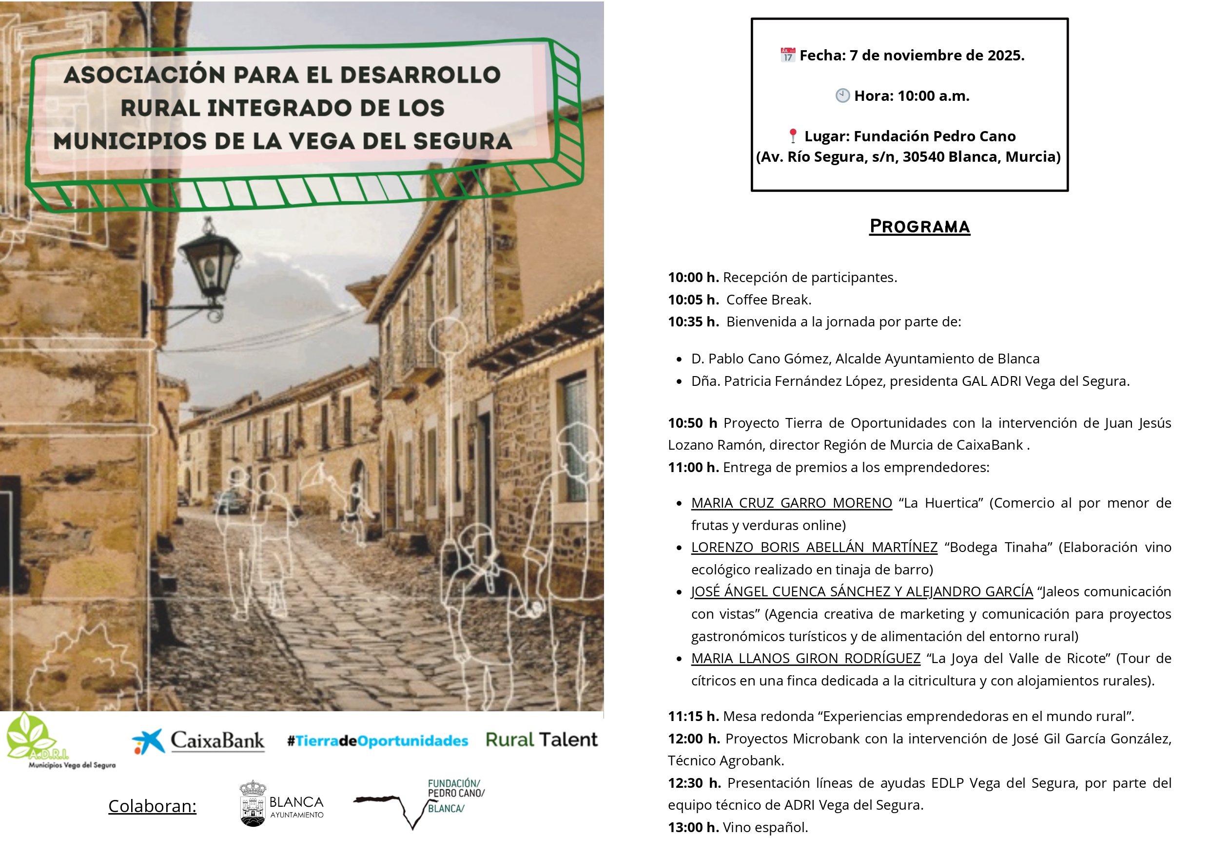El próximo viernes 7 de noviembre a las 10:00 h se celebrará en Blanca (Murcia) la jornada “Tierra de Oportunidades”, organizada por CaixaBank, ADRI Vega del Segura y Rural Talent. Un encuentro dirigido a emprendedores, instituciones y agentes de desarrollo rural que busca promover el talento y la innovación en el entorno rural.